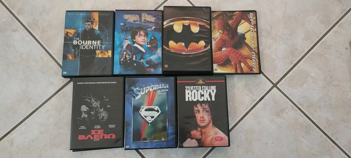 7 σειρές γνωστών κινηματογραφικών ταινιών. 29 DVD. Περιλαμβάνει τις ταινίες THE BOURNE IDENTITY, THE BOURNE SUPREMACY και THE BOURNE ULTIMATUM. Ο ΧΑΡΙ ΠΟΤΕΡ ΚΑΙ Η ΦΙΛΟΣΟΦΙΚΗ ΛΙΘΟΣ, Ο ΧΑΡΙ ΠΟΤΕΡ ΚΑΙ Η ΚΑΜΑΡΑ ΜΕ ΤΑ ΜΥΣΤΙΚΑ, Ο ΧΑΡΙ ΠΟΤΕΡ ΚΑΙ Ο ΑΙΧΜΑΛΩΤΟΣ ΤΟΥ ΑΖΚΑΜΠΑΝ και Ο ΧΑΡΙ ΠΟΤΕΡ ΚΑΙ ΤΟ ΚΥΠΕΛΟ ΤΗΣ ΦΩΤΙΑΣ. ΜΠΑΤΜΑΝ, Η ΕΠΙΣΤΡΟΦΗ ΤΟΥ ΜΠΑΤΜΑΝ, ΜΠΑΤΜΑΝ ΓΙΑ ΠΑΝΤΑ, ΜΠΑΤΜΑΝ ΚΑΙ ΡΟΜΠΙΝ, BATMAN BEGINS και Ο ΣΚΟΤΕΙΝΟΣ ΙΠΠΟΤΗΣ. SPIDER-MAN 1,2,3. ΣΕ ΒΛΕΠΩ (SAW) 1,2,3. SUPERMAN 1,2,3,4 και SUPERMAN Η ΕΠΙΣΤΡΟΦΗ. ROCKY 1,2,3,4,5.
