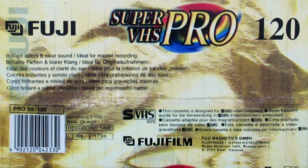 Κασέτα video FUJI Super VHS Professional Master Quality. Καινούρια και σφραγισμένη σε εργοστασιακή συσκευασία. Διάρκεια εγγραφής 120 λεπτά. Μπορεί να χρησιμοποιηθεί για εγγραφή εικόνας και ήχου σε VHS & S-VHS recorders και εγγραφή ψηφιακού ήχου PCM σε ADAT recorders.