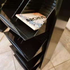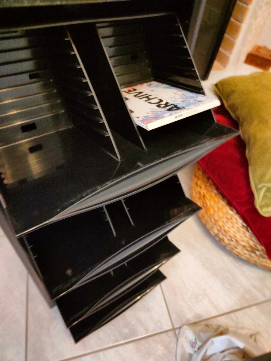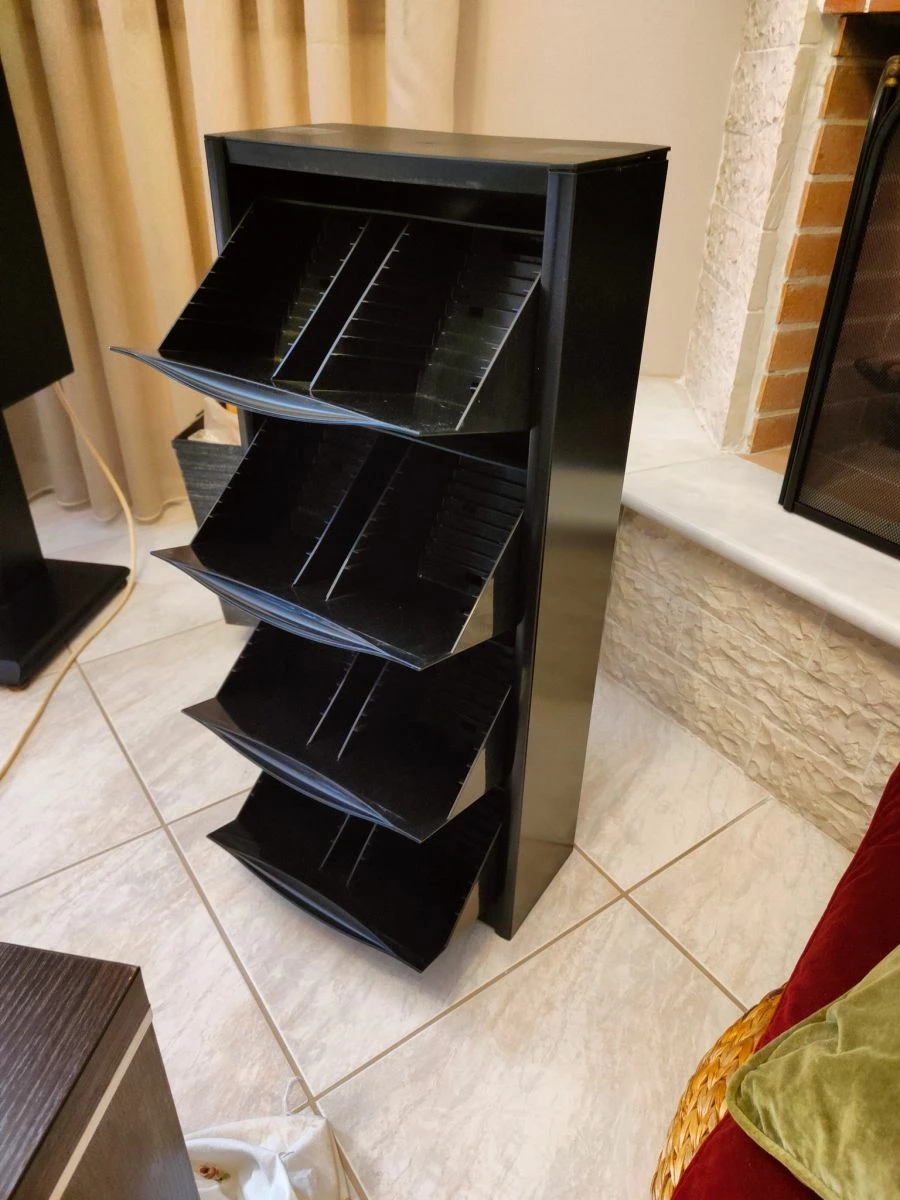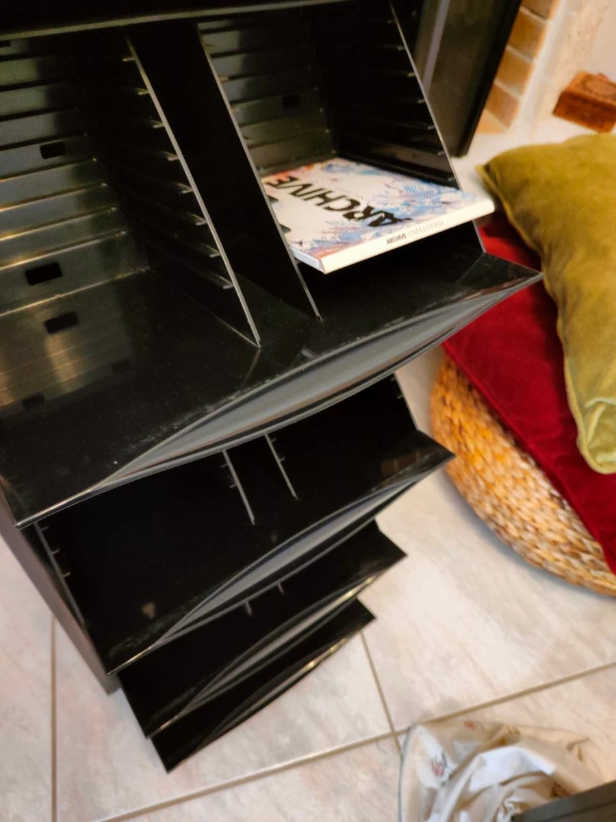 Μεταλλική συρταριερα – θήκη CD 80 θέσεων. Μπορεί να μπει και κρεμαστή σε τοίχο. Πολύ καλή κατάσταση