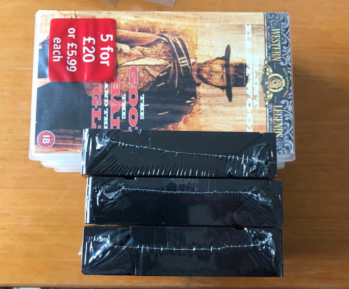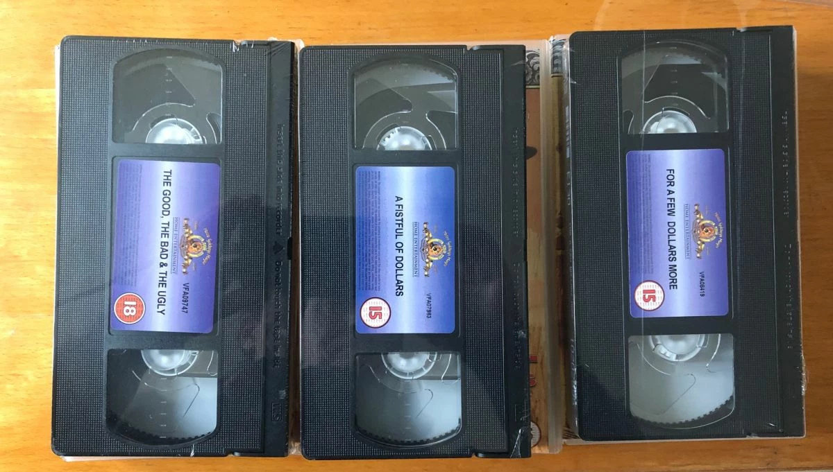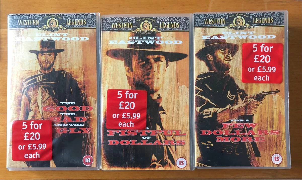 3 βιντεοκασέτες με την επική τριλογία western του Sergio Leone. Οι ταινίες είναι στα Αγγλικά χωρίς Ελληνικους υπότιτλους. Αγορασμένες στην Αγγλία, σφραγισμένες. Η τιμή πώλησης είναι 15€ έκαστη, 40€ και οι 3. Ευχαριστώ.