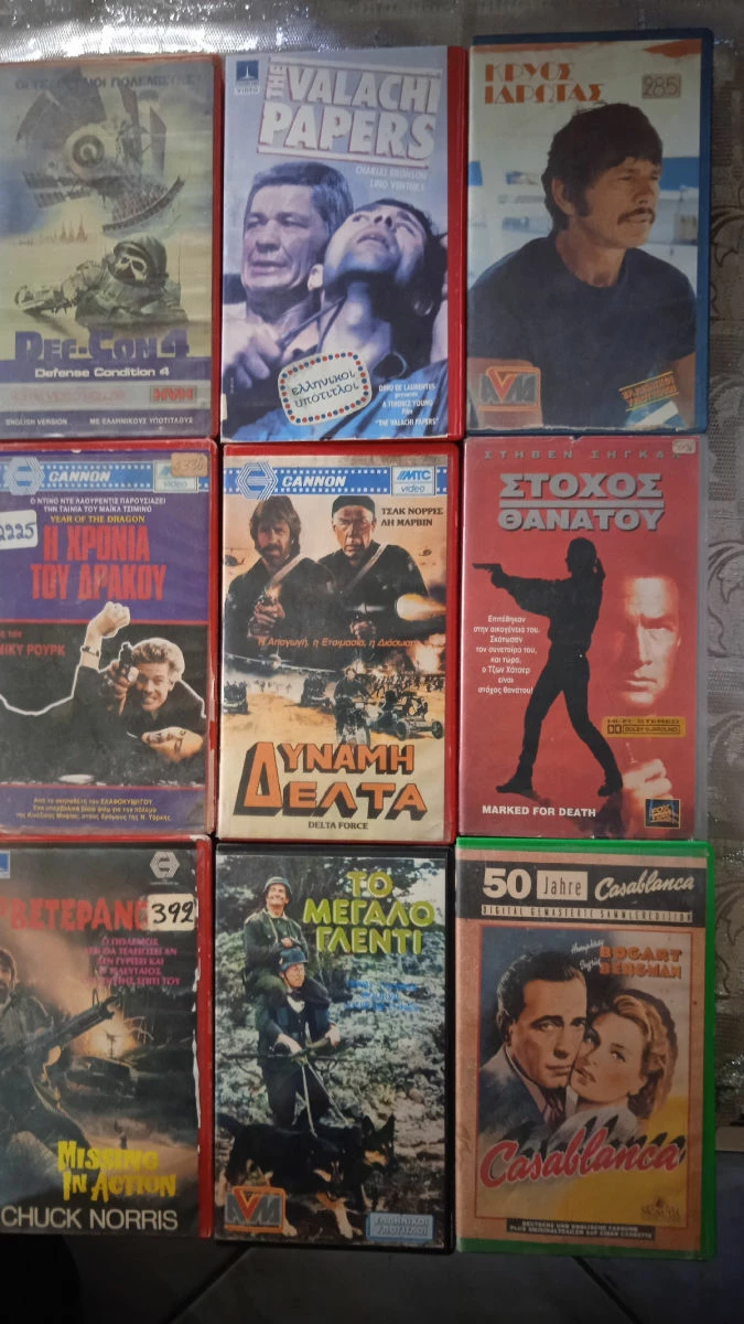 Σε καλή κατάσταση όλα με ελληνικούς υπότιτλους εκτός από την CASABLANCA. πωλούνται πακετο αλλά και μεμονωμένα προς 10 ευρώ η μια. Οι Βιντεοκασέτες Φάκελος Βαλατσι και Κρύος ιδρώτας με τον Τσαρλς Μπρόνσον έχουν πωληθεί.